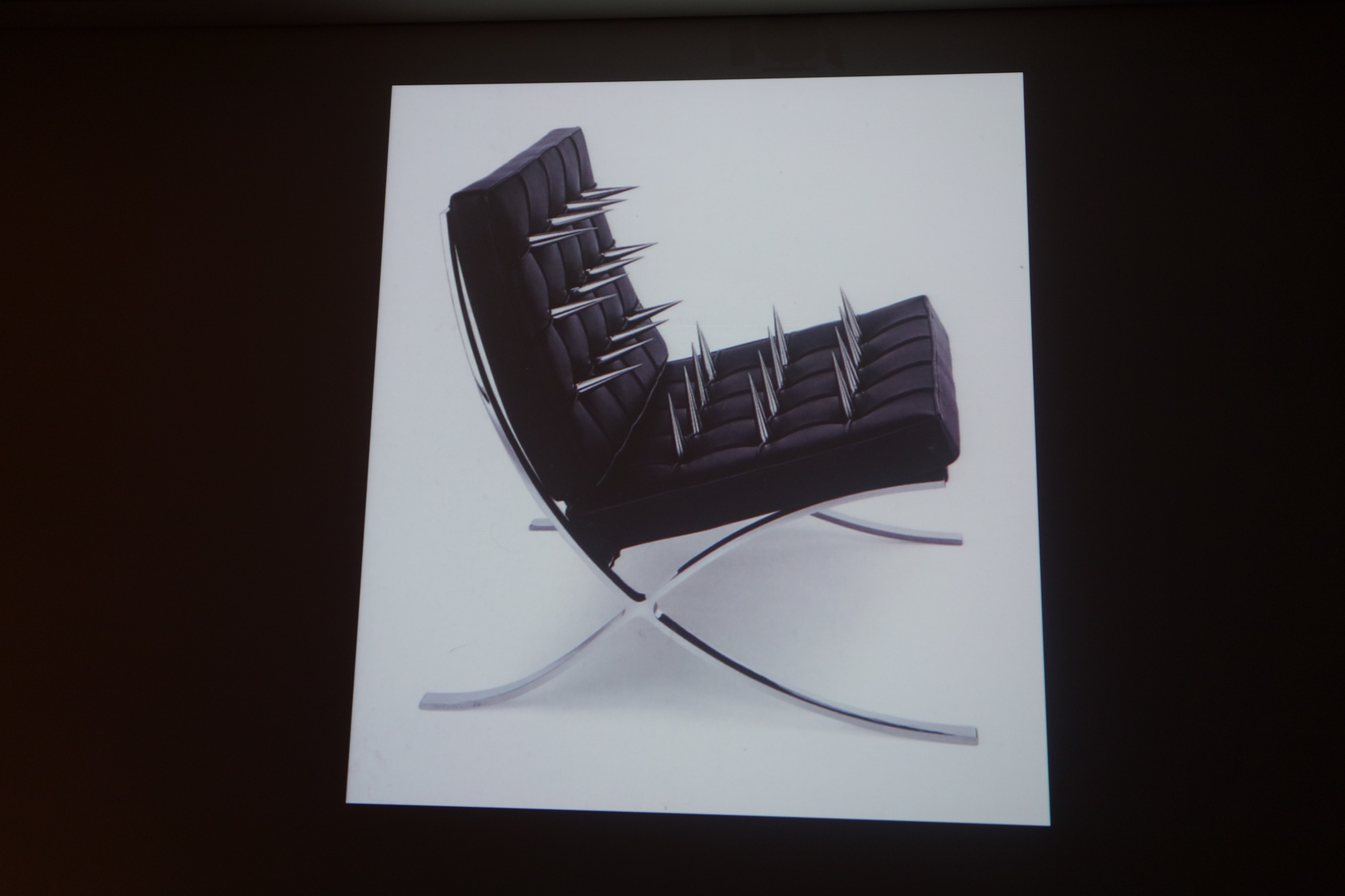 Cécile Croce & Corinne de Toury : La beauté en meurtriers. Le design qui joue avec la notion du confort, le design “inconfortable”, un design d’empêchement dans lequel l’objet est ennemi du corps > “à trop bien vivre, on existe plus”. Le rôle du design “inconfortable” est de donner la place au corps, qui amène une réflexion et remise ne cause – critical design, post-modernism objets. L’inconfort est ce qui est du trop ou de pas assez, c’est le design qui fait mal mais qui amène un accord affectif et sexuel, une pulsion de la mort. Alors le design inconfortable introduit l’exotique de la douleur, il nous met en danger plus au niveau psychique; il peut être visuellement confortable et virtuellement inconfortable et ouvre l’espace du design traditionnel dans lequel ces deux partie sont collées.