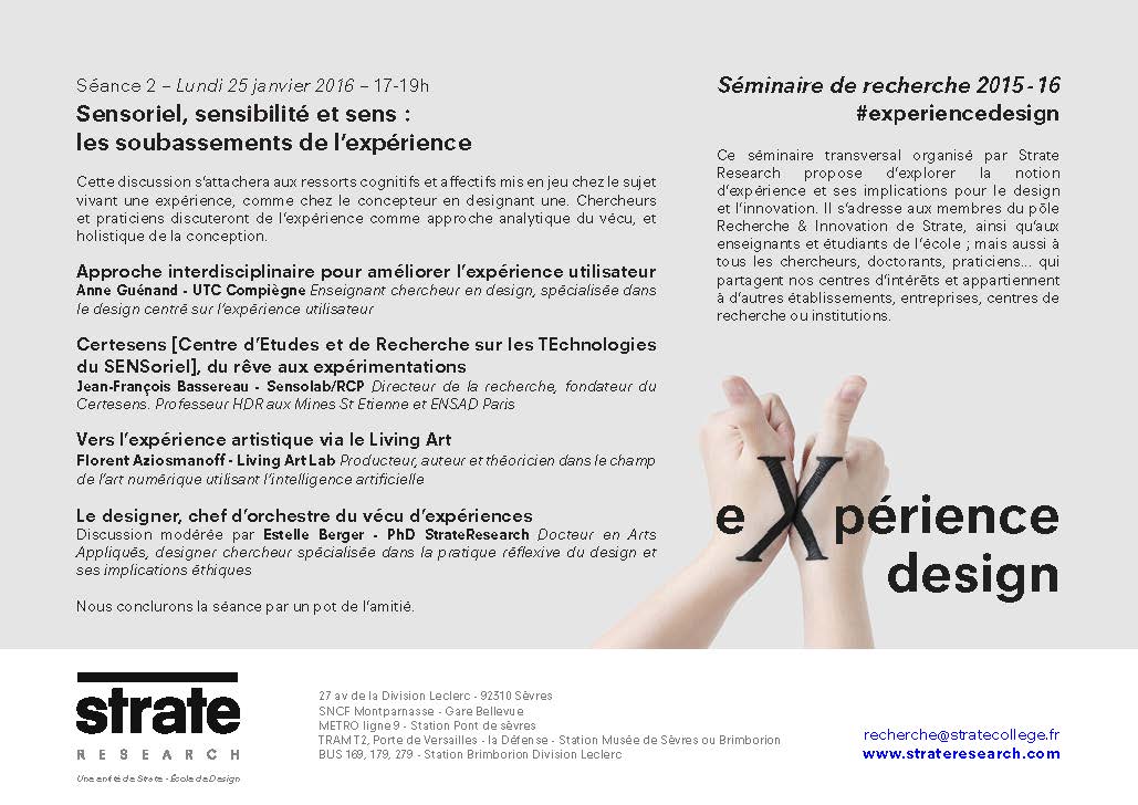 Après une première séance consacrée à la définition des notions d’expérience utilisateur et de design d’expériences, nous vous donnons rendez-vous le 25 janvier pour “Sensoriel, sensibilité et sens : les soubassements de l’expérience”.