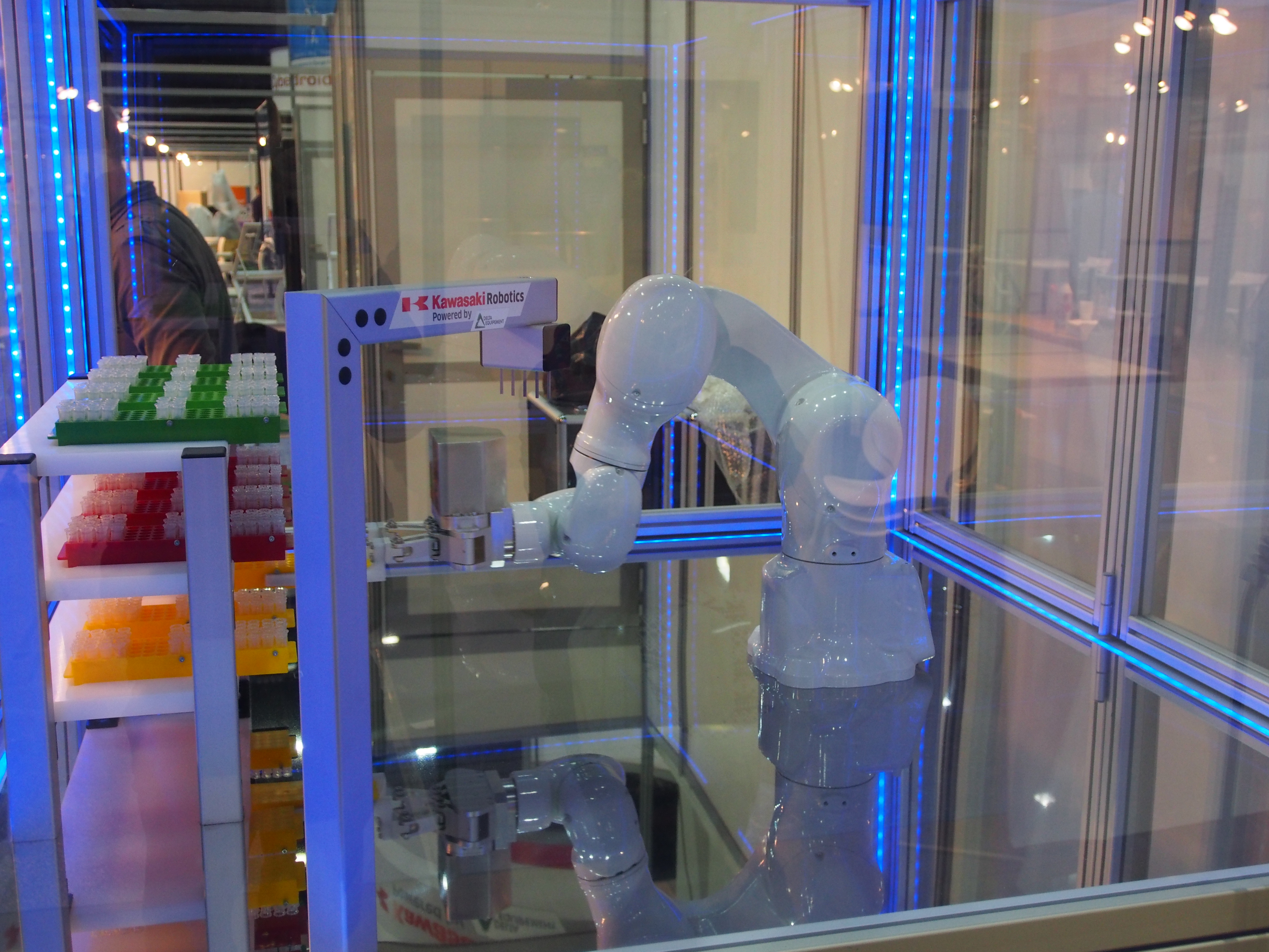 Impossible de passer à coté des grands bras articulés qui trient des plaquettes minuscules, portent des écrans massifs ou encore opèrent des mannequins. Impressionnants par leur précision, leur rapidité et leur agilité, ils possèdent différents styles de commandes (du joystick à la tablette en passant par la télécommande), de mission ou encore de texture (antichoc, mémoire de forme…) Même si beaucoup d’entre eux ne sont « pas fait pour remplacer nos métiers mais pour travailler avec nous » parfois l’image d’une usine remplie de robots commandés par un seul chef humain s’impose à nous. Ces robots destinés à effectuer des tâches précises répétitives et fatigantes donnent l’impression qu’ils se débrouillent très bien sans nous. (Photo ci-contre : Le robot du constructeur Kawasaki Robotics trie des échantillons sur une étagère)