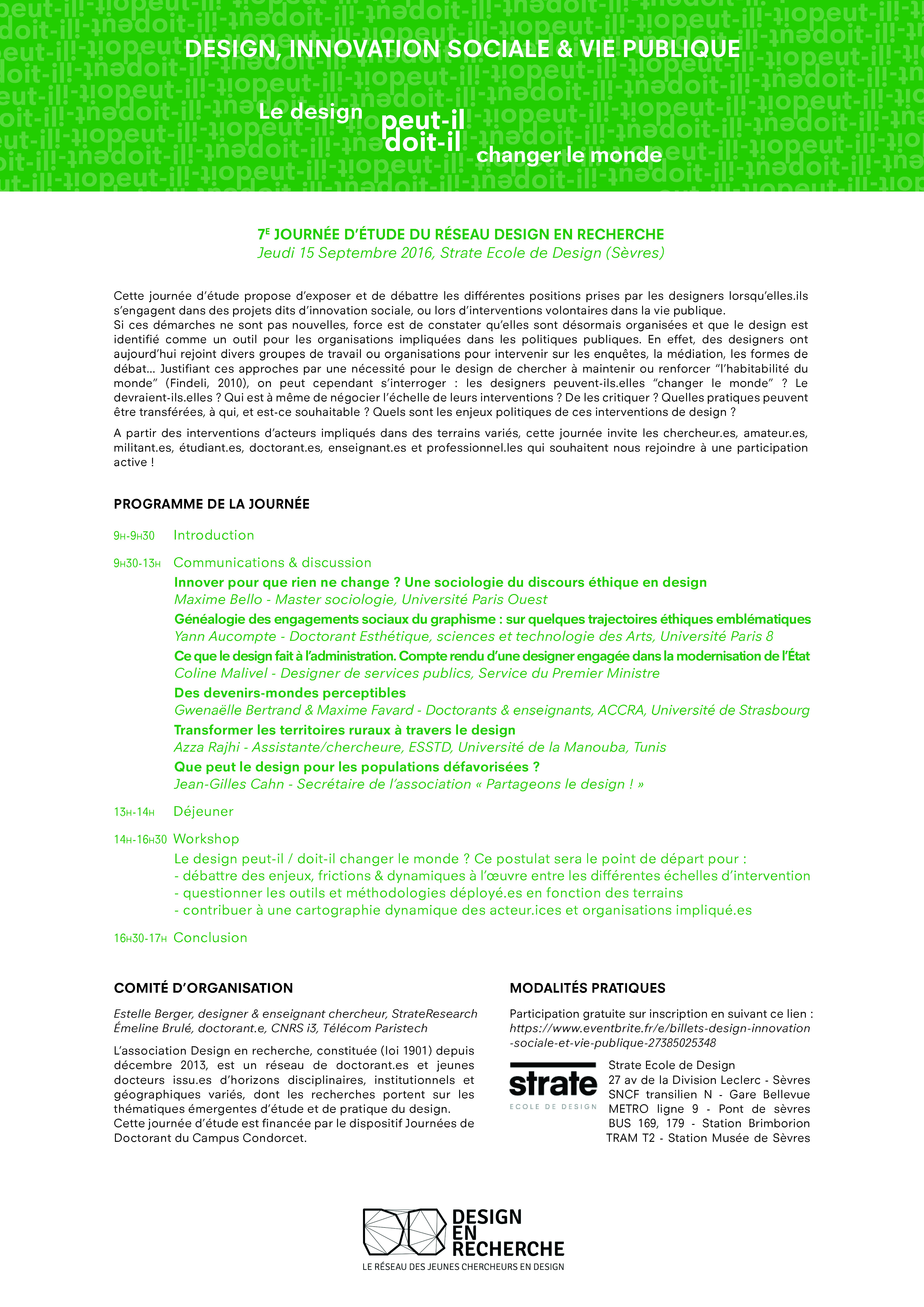 * 7e journée d’étude du réseau Design en recherche, le 15 septembre 2016. Organisation : Estelle Berger & Emeline Brulé