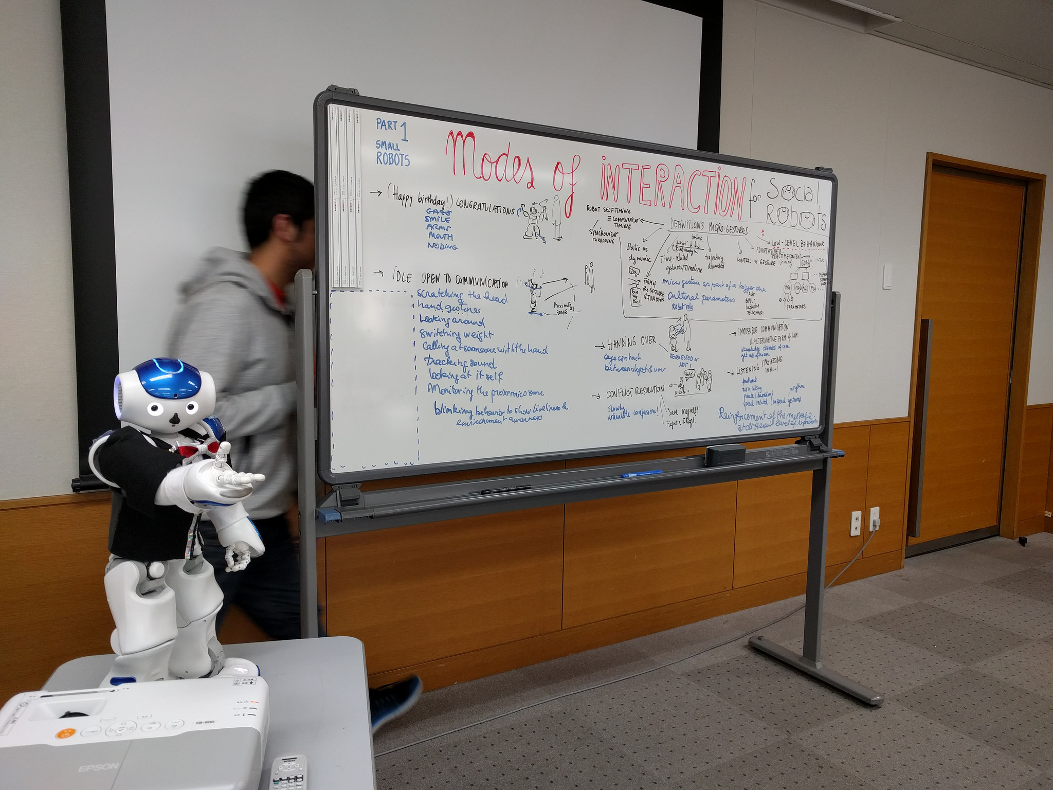 Another inspiring talk was given by Prof. Takayuki Kanda on robots in the public space. He researches this topic for more than 10 ans, experimenting Wizard of Oz applications on a robotic platform built in his lab. This research focuses on how robots could replace humans in advertising tasks (near a shop) and how robots could give directions in the public place (in the malls). The main idea of this research is to understand human behaviour (individual and group) in these places and how the robot could enter into a conversation, wait for a task, respond to abuse or violence etc. Even if the context might seem quite simple (a public mall), the H-R communication is rich and complex.