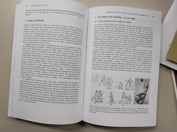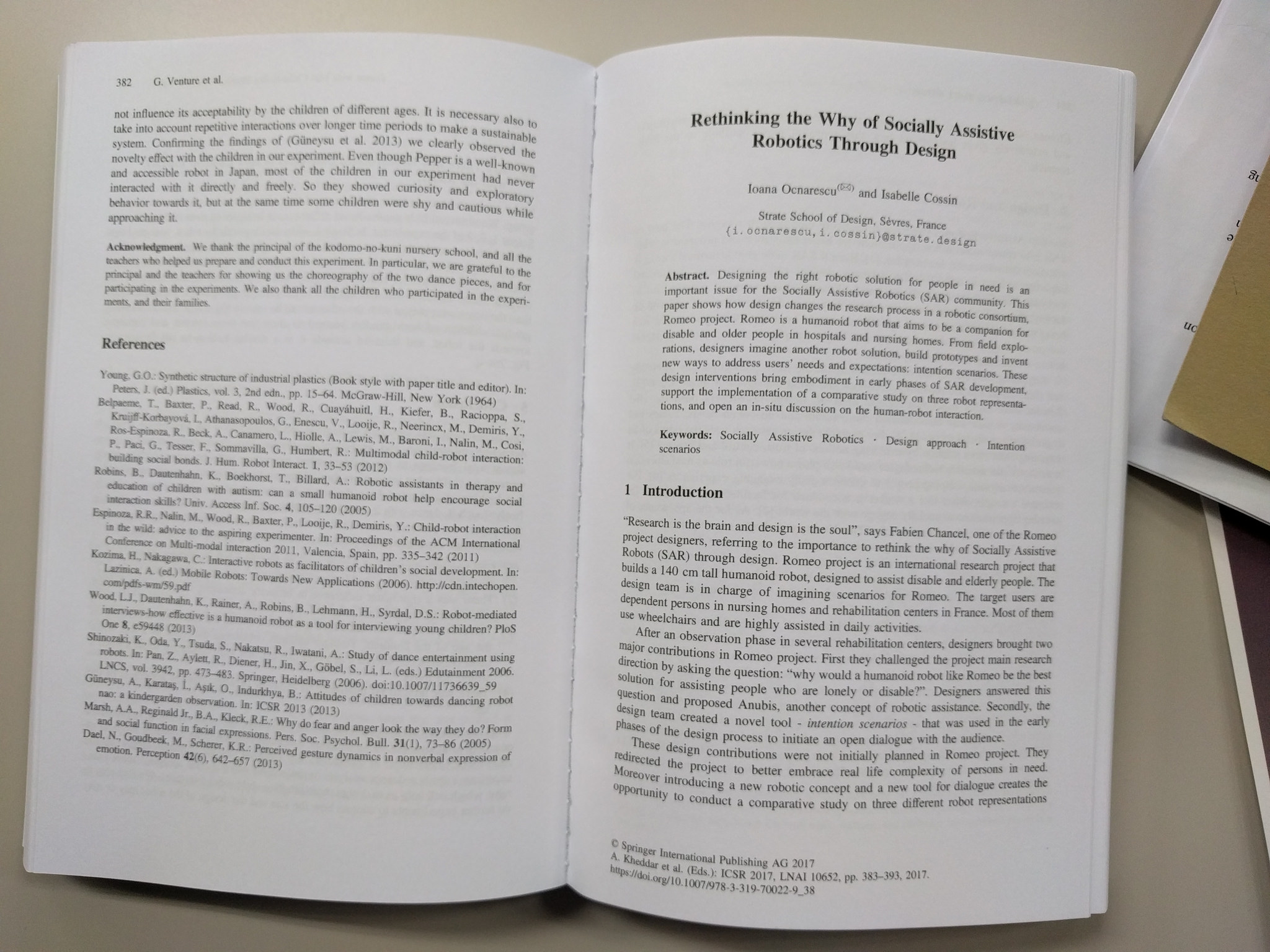 Other researchers of this conference focused on specific fields on social robotics: gaze, protexisms, the notion on trust and even robotics and religion. Only few articles on social sciences and design. Among all, here is ours: