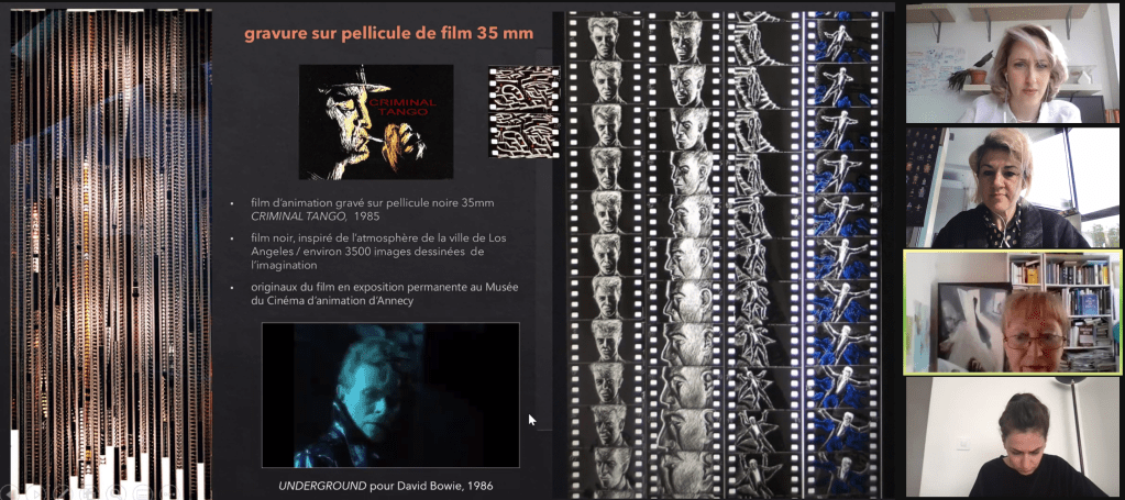 La première partie était consacrée à Solweig Von Kleist, artiste plasticienne, réalisatrice de films d’animation, d’installation animée et de performances en live de dessins anamorphiques. Afin d’introduire et de contextualiser ce travail très riche en lien avec le séminaire, Isabelle Cossin a fait une petite présentation sur le cinéma d’animation. Elle explique que le travail de Solweig Von Kleist appartient à un pan du cinéma d’animation plus confidentiel que ce que nous avons l’habitude de voir (dessins animés, films d’animation grand public…), qui est plutôt à la lisière du cinéma expérimental et du film d’artiste. Le principe du cinéma d’animation où le résultat final est une articulation de plusieurs images conçues pour donner sens une fois assemblées fait écho à la méthodologie du projet de design puisque le temps de la narration finale est dissocié de celui de la création. Le projet est alors conçu comme des séquences narratives indépendantes mais pensées les unes par rapport aux autres et c’est l’agencement final qui fait advenir le projet de design et lui donne son sens. Un des exemples les plus parlant de l’implication du corps de l’artiste dans ce type d’animation est la technique de la gravure sur pellicule. La minutie du geste sur la petite surface d’une pellicule, la répétition sur différents photogrammes d’affilée et l’absence de prise de vue engagent le corps de l’artiste en appelant une pression et une concentration constantes. Une fois animée, l’œuvre finale fait voir tout un processus et présentifie ainsi le corps de l’artiste. Voir le premier film d’animation avec la technique de la gravure sur pellicule, Criminal Tango.