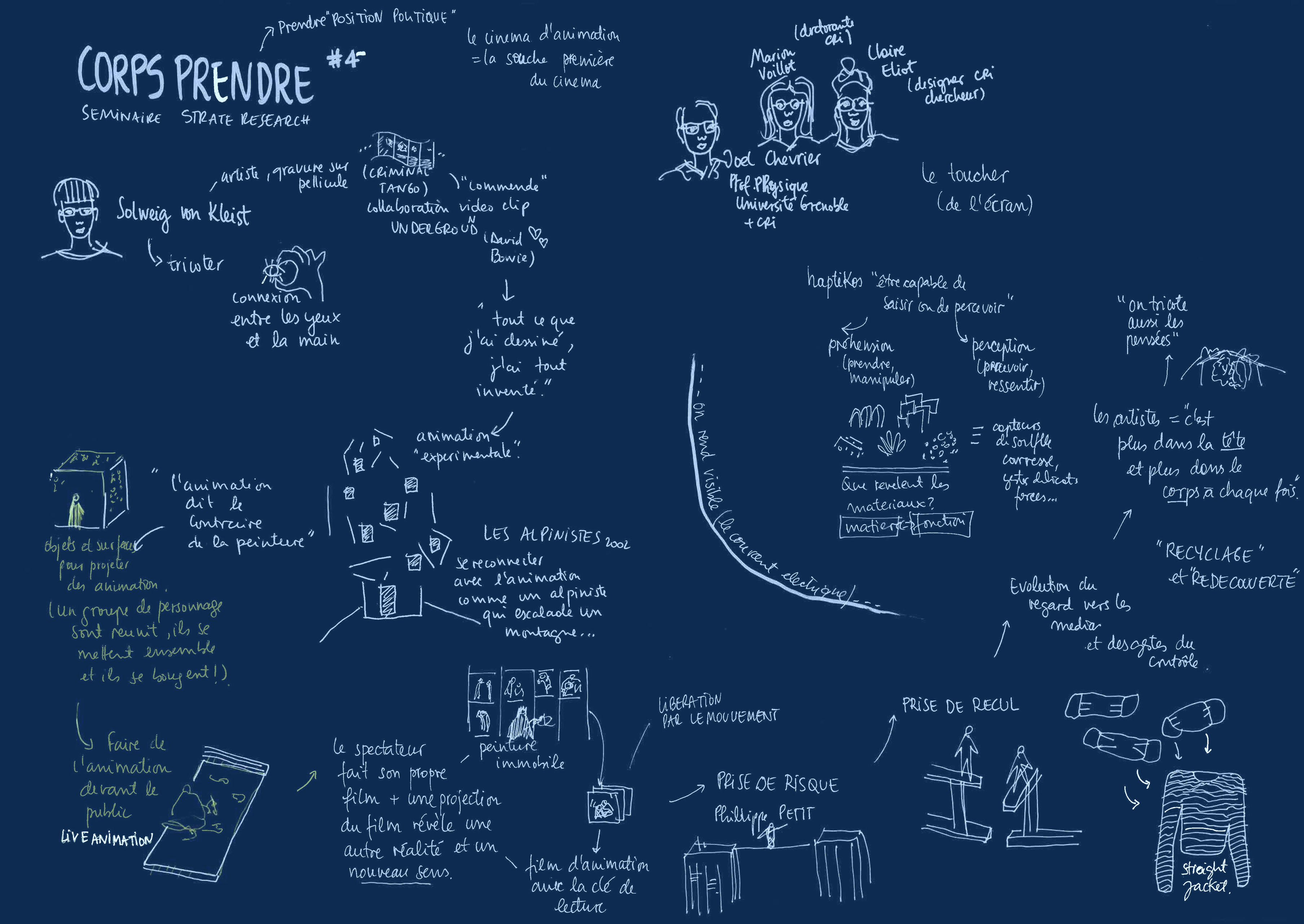La quatrième séance du séminaire transdisciplinaire CORPS-PRENDRE clôture un premier cycle de réflexion à propos de la matérialité de la recherche autant à travers l’implication du corps du chercheur que des corps-objets auxquels il donne naissance pour servir au développement d’un processus de recherche complexe. Si les questionnements par rapport au corps en mouvement et particulièrement le rapport au toucher lie les deux interventions, nous avons eu l’occasion de confronter deux approches très différentes, celle d’une artiste, Solweig Von Kleist et celle de designers et chercheur.es, Marion Voillot, Claire Eliot et Joël Chevrier.