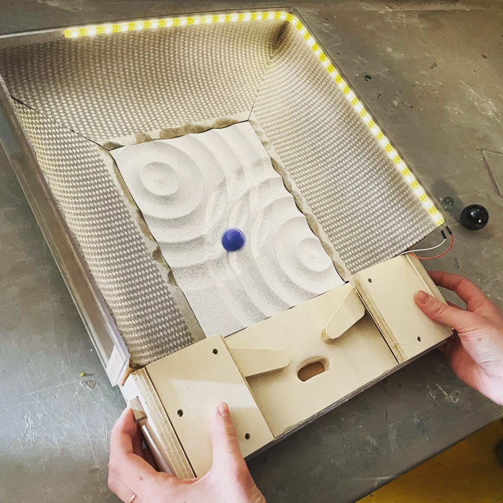 Le dispositif du jeu projette la bille dans un champ de forces constitué de stries, qui guident et animent son mouvement. Le son et la lumière ainsi générés rendent le dispositif organique plus que mécanique.