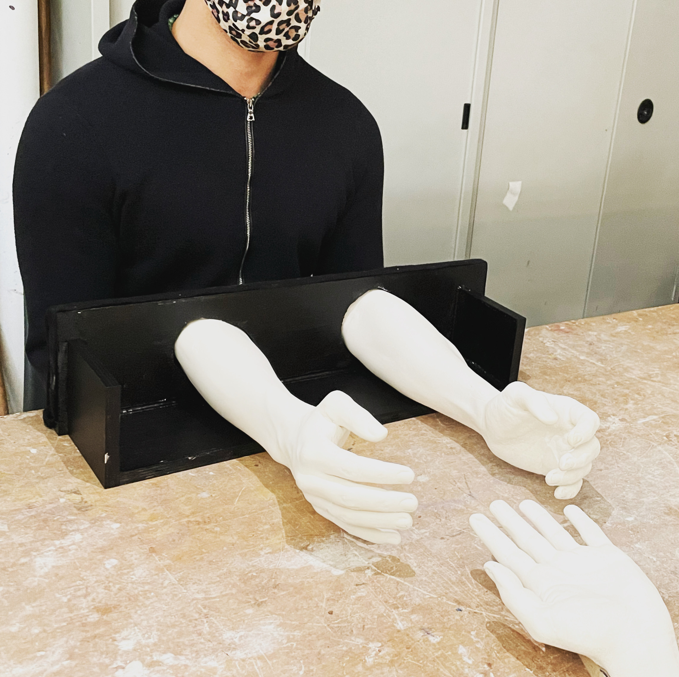 Dans le prolongement de notre corps, deux bras en plâtre créent l’espace suspendu d’un moment où tout pourrait arriver. La tension devient vibrante, on se prend à imaginer l’énergie entre eux prendre vie.