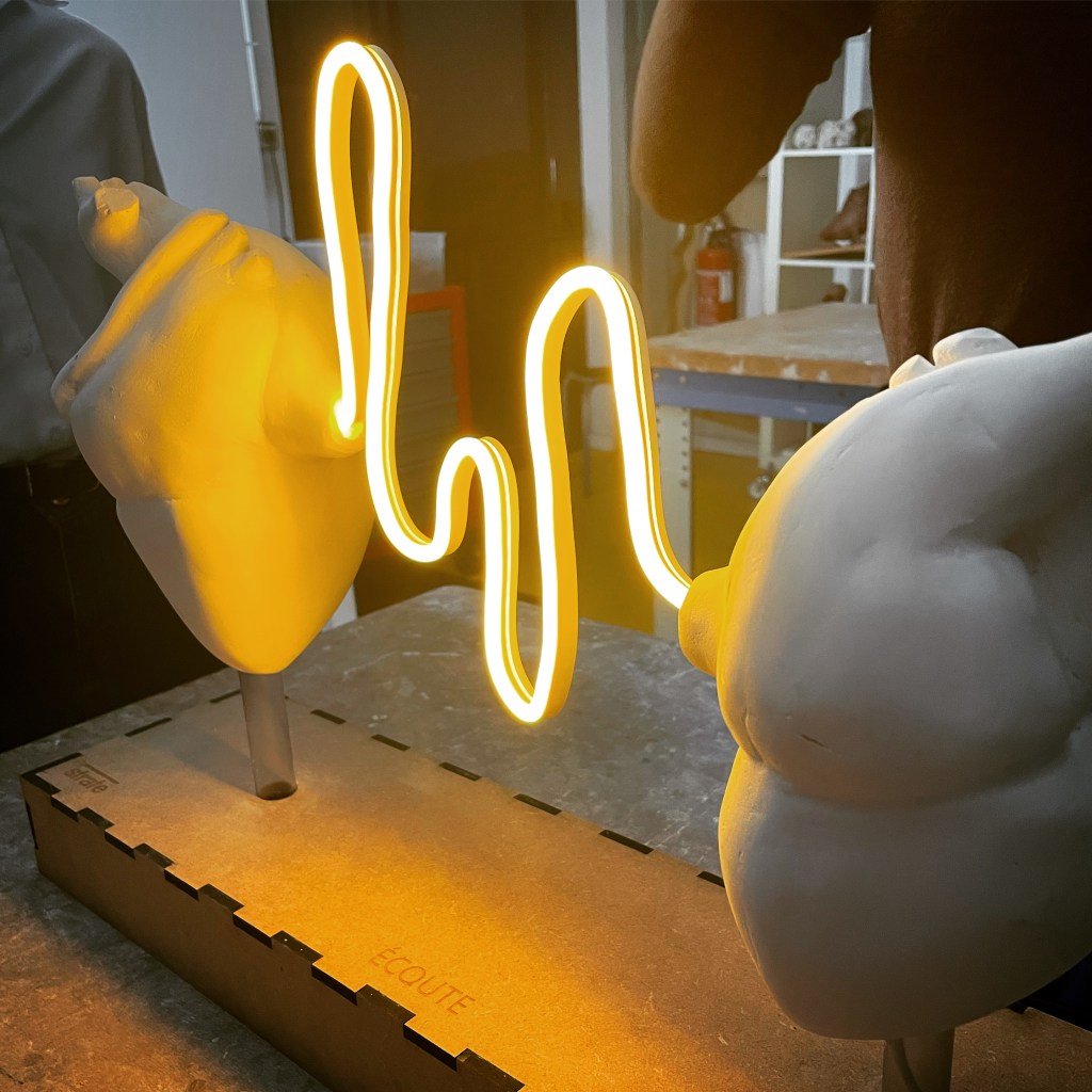 Deux coeurs sont mis en relation par un fil lumineux, et le son de leurs battements synchrones. Le lien entre mère et enfant est évoqué, incarné par le travail de moulage qui a nécessité de réaliser plusieurs modèles positifs et négatifs du coeur.