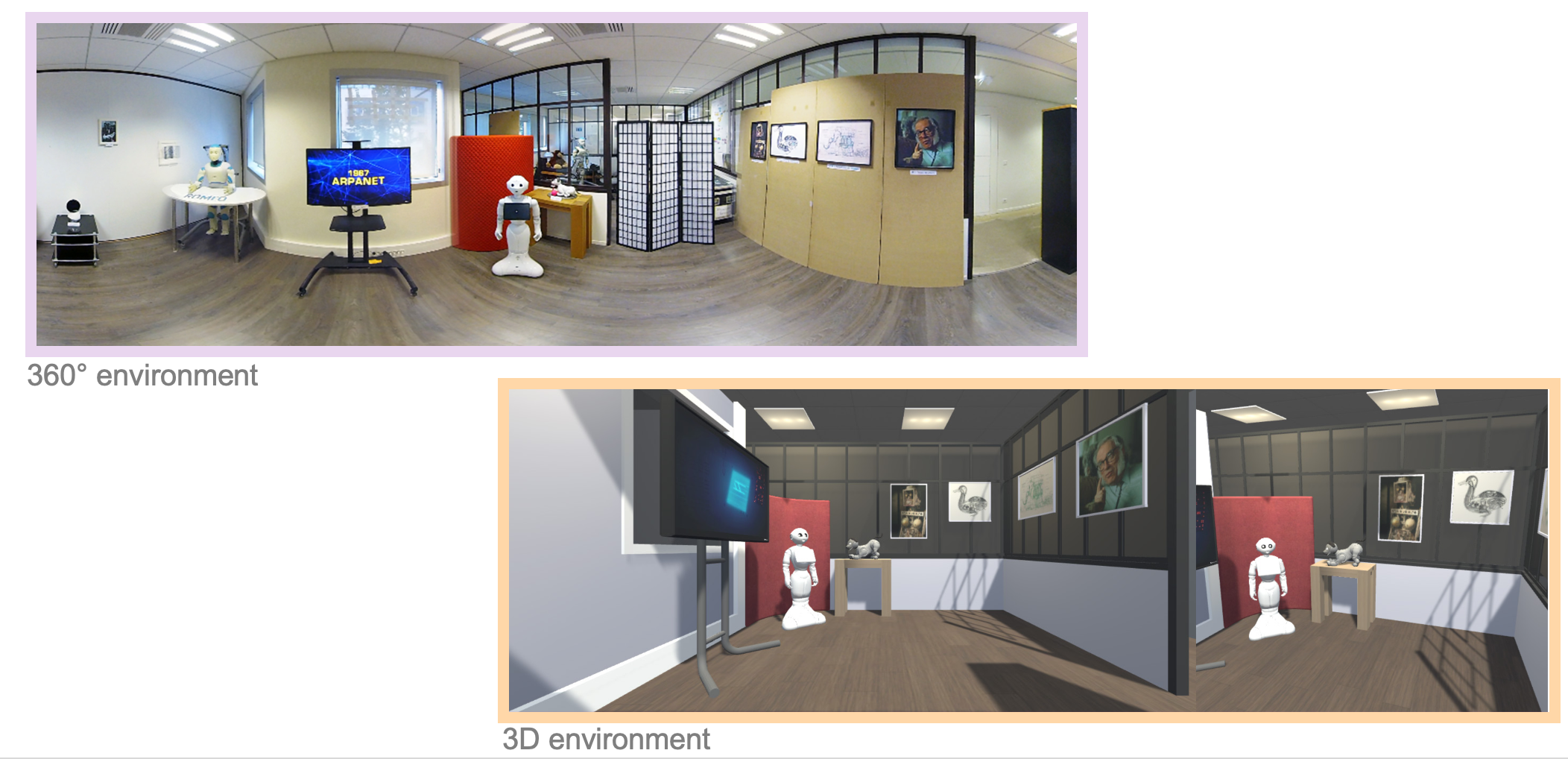 Cette étude portait sur une visite virtuelle d’un musée, accompagnée par un robot social Pepper comme guide dans un des deux environnements virtuels créés : 3D ou 360°. Ces environnements ont été créés par des étudiants de Strate avec Damien Legois, Ioana Ocnarescu et Isabelle Cossin. Le but de cette étude était d’explorer plus précisément les différences entre les environnements 360 ou 3D en termes d’engagement, d’immersion et d’expérience globale de l’utilisateur ainsi que questionner la présence d’un robot social comme guide de musée.
