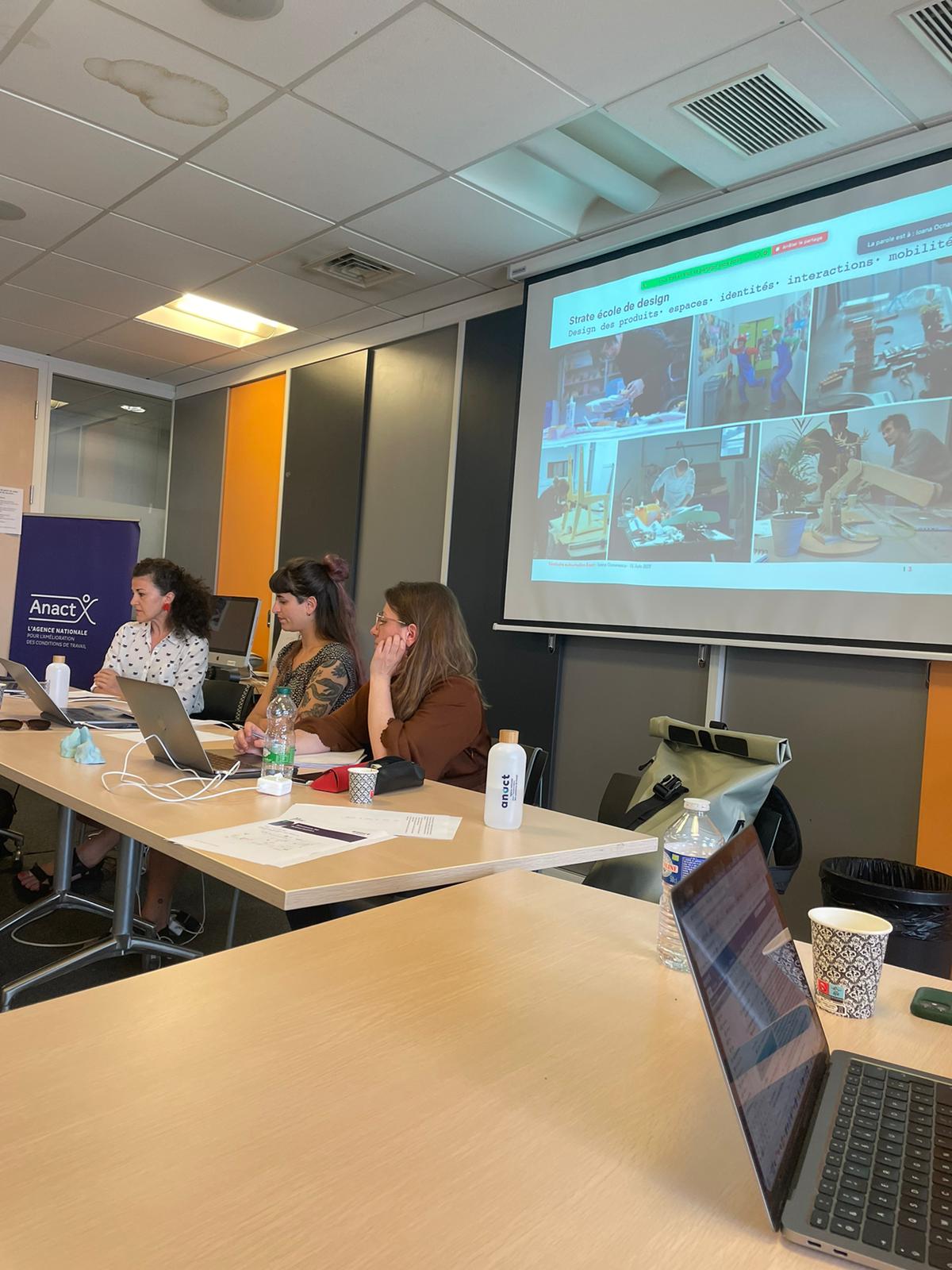 Le 15 et 16 juin 2023, ont eu lieu 2 journées du séminaire du groupe de travail sur la simulation au sein de l’Anact organisées par Sarah Dulac (designer) et Manon Keusch-Bessard (psychologue-ergonome). L’audience étaient formée des agent.e.s au sein des agences régionales (Aract – « des agences qui aident les entreprises à mener des projets d’amélioration des conditions de travail souvent au moyen de modes d’action collectifs, en partenariat avec les acteurs locaux ») et de l’Anact. Installée à Lyon, l’Anact est placée sous la tutelle du Ministère en charge du Travail et a pour vocation “d’améliorer les conditions de travail en agissant notamment sur l’organisation du travail et les relations professionnelles” (https://www.anact.fr/lanact/qui-sommes-nous).