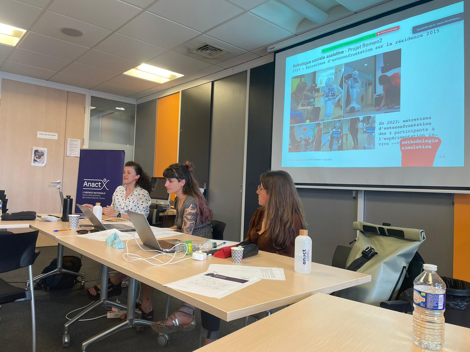 Dans le cadre de cette résidence, des équipes de 4 à 5 personnes ont été formées pour jouer des scénarios écrits sous forme de courtes pièces de théâtre. Pour cette expérimentation d’une semaine les robots étaient manipulés comme des marionnettes par une personne. Bien que les scénarios n’aient pas été finalisés, ils ont été élaborés à partir des résultats d’une grande étude menée auprès de 72 personnes vivant en centre de rééducation et en maisons de retraite, portant sur la robotique d’assistance. Ces scénarios ont été conçus pour représenter des moments de la vie quotidienne d’une personne âgée vivant chez elle avec un robot, soulevant ainsi des questions auxquelles plusieurs fins étaient possibles. L’objectif de expérimentation était de trouver des solutions et des dénouements en jouant et en discutant avec les différentes personnes constituant les équipes de scénarisation. Huit ans plus tard, j’ai eu l’occasion d’interviewer les membres d’une des équipes de scénarisation dont j’ai également fait partie. À l’aide d’une grille d’entretien d’auto-confrontation et de vidéos enregistrées en 2015, j’ai interrogé trois personnes : une ergothérapeute, une designer-chercheuse et une designer ayant pratiqué le théâtre d’improvisation (10 ans de pratique). Bien que je ne détaillerai pas toutes les subtilités de ces interviews ici, j’ai tenté de répondre à certaines questions proposées lors du séminaire ANACT.