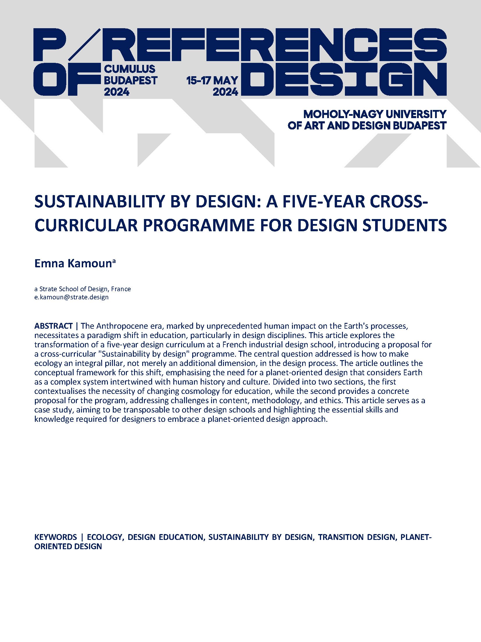Dans une première demi journée consacrée à l’enseignement du design pour demain, j’ai pu présenter mon article “Sustainability by design : cross-curricular programme for design students”. Ce travail rend compte d’une recherche en cours sur la manière dont on pourrait construire un programme transversal consacré à l’écologie au cœur du cursus Design en 5 ans à Strate. Répondant aux recommandations de chercheurs et experts des instances extra gouvernementales, ainsi qu’aux incitations et impératifs spécifiques du MESR, le but premier de ce programme est de garantir aux étudiants en design un socle de connaissances commun sur les enjeux de transitions (environnementaux, sociaux, politiques…). Cela conduirait à faire de l’écologie la colonne vertébrale du design process et non une des dimensions à traiter dans le projet.