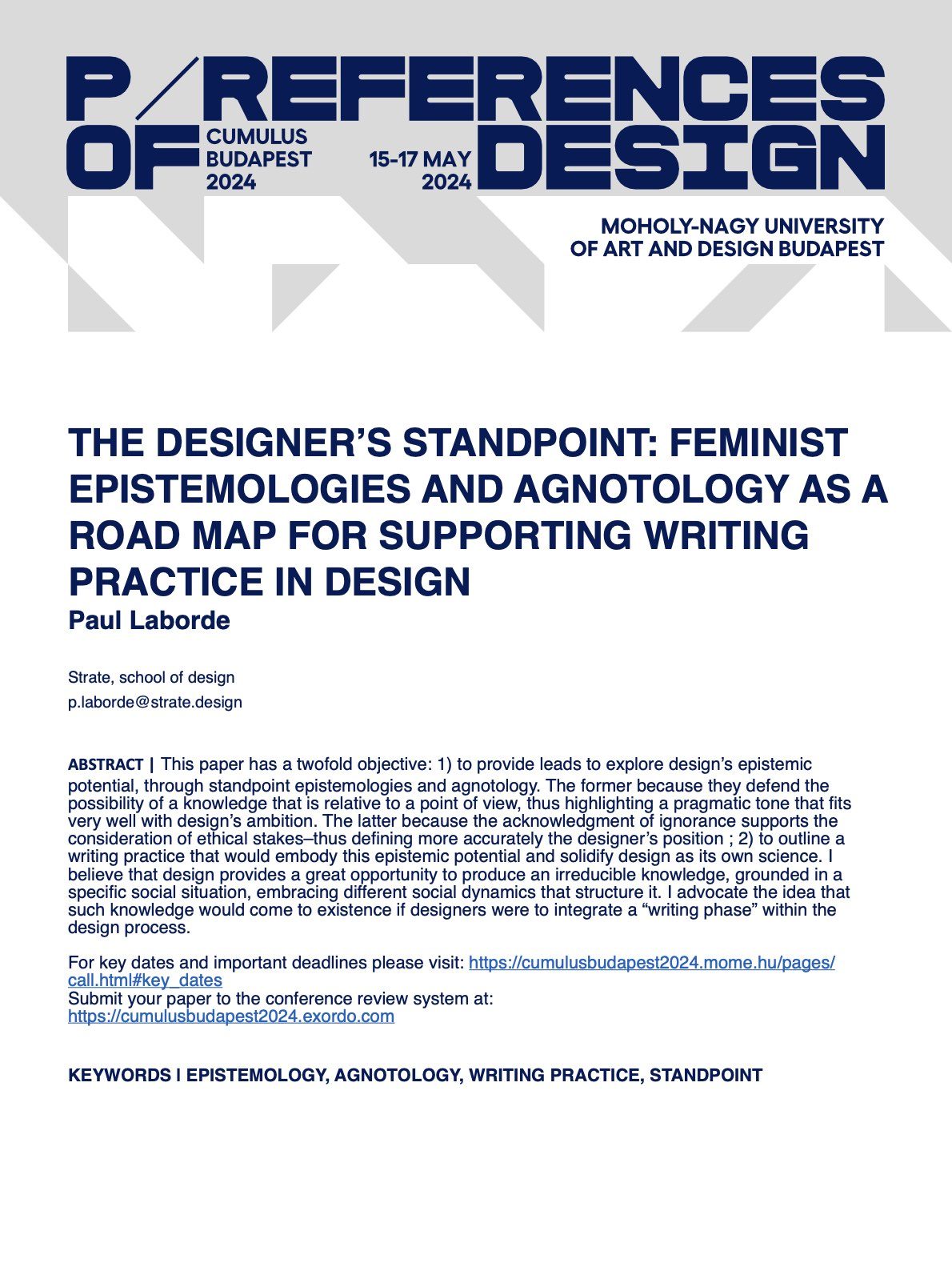 Paul Laborde a présenté un article “The designer’s standpoint: feminist epistemologies and agnotology as a roadmap for supporting writing practice in design” dans la session Converging bodies of knowledge. L’objectif de l’article est de s’appuyer sur les épistémologies du point de vue pour valoriser les connaissances issues des projets de design : faire advenir la perspective de celles et ceux qui subissent une situation problématique permet de mettre en lumière le savoir spécifique qui y est attaché. Par ailleurs, l’agnotologie offre un horizon original pour des praticiens à cheval entre science et art : il s’agit d’abandonner la conception spontanée de l’ignorance comme absence de connaissance pour la comprendre comme une fonction inévitable du regard que l’on porte sur une situation. Enfin, tout ceci nous conduit à défendre une pratique de l’écriture au sein des projets de design pour articuler ces différents regards au moment de la conception.