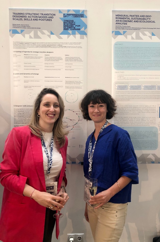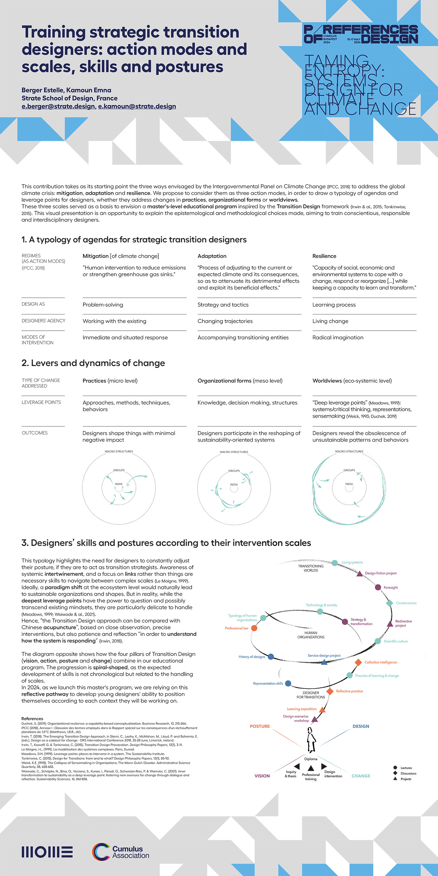 Parallèlement, avec Estelle Berger, nous avons contribué à la session posters avec le poster “Training strategic transition designers: action modes and scales, skills and postures”. Ce travail prend pour point de départ les trois façons envisagées par le GIEC de concevoir l’intervention humaine pour lutter contre la crise climatique : l’atténuation, l’adaptation et la résilience, pour penser les échelles et moyens d’actions des designers stratèges des transitions. Cette première théorisation constitue les fondements pédagogiques de la nouvelle formation Design Transition[s] que nous co-dirigeons.