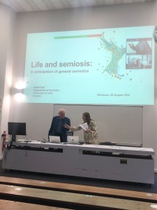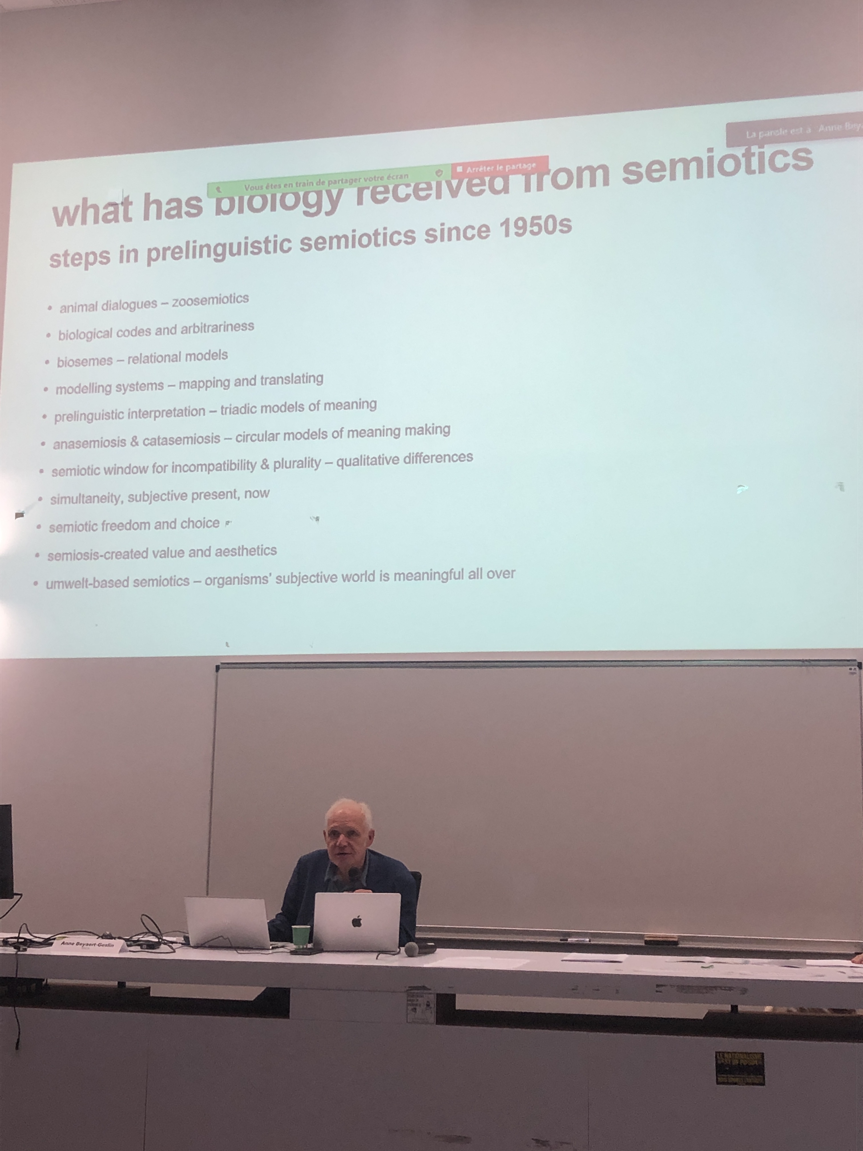 Kalevi Kull, éminent professeur de biosémiotique, a donné le ton de la première journée avec une présentation intitulée Life and semiosis: general semiotics revisited. Kull a plongé l’audience dans l’univers fascinant de la biosémiotique, discutant de la manière dont les signes sont générés par les organismes vivants. Il a évoqué le concept de “stigmergie” diffusé par le biologiste Pierre-Paul Grassé, illustrant comment les actions des organismes laissent des signes interprétables par d’autres, agissant sur eux en leur faisant faire des actions à leur tour. Cette idée est essentielle pour comprendre l’évolution de la communication dans la nature.