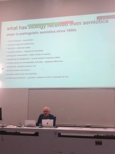 Kull a insisté sur la nécessité d’une discipline comme la sémiotique pour pallier ce que la biologie ne peut entièrement expliquer. Il a rappelé la coexistence de deux visions de la biologie : celle, classique, basée sur la réplication génétique (replication-based biology), avec une approche néo-darwinienne, biophysique; et une autre, basée sur l’agentivité (agency-based biology), c’est le courant incluant l’épigénétique et la bio sémiotique, qui voit les organismes comme acteurs de leur propre évolution, influençant la sélection à travers leurs actions.