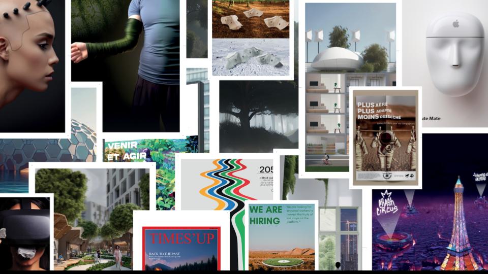 Déjà au niveau du choix de la technique de représentation, le premier constat intéressant est que pour plus d’un projet sur 2 (57%) les étudiant·e·s ont eu recours à l’IA générative contre seulement 5% qui ont choisi d’utiliser une technique manuelle (dessin, collage, photographie). Cela va dans le sens de l’idée que projeter et représenter le futur est une tâche vertigineuse (comme le disent Emmanuel Grimaud et Julien Wacquez dans cet article). Alors la délégation de la tâche à une IA est-elle un symptôme d’une peur qui pourrait paralyser l’imagination ? ou au contraire, est-ce que le passage par cet outil qui donne un résultat rapide est une volonté de garder le contrôle sur ce vertige, comme si pouvoir représenter le futur contribue déjà à notre agentivité pour le faire advenir ? Nous avons prévu de consacrer un autre article spécifiquement à ces questions (qui sera présenté lors de la prochaine conférence Cumulus à Nantes en juin 2025).