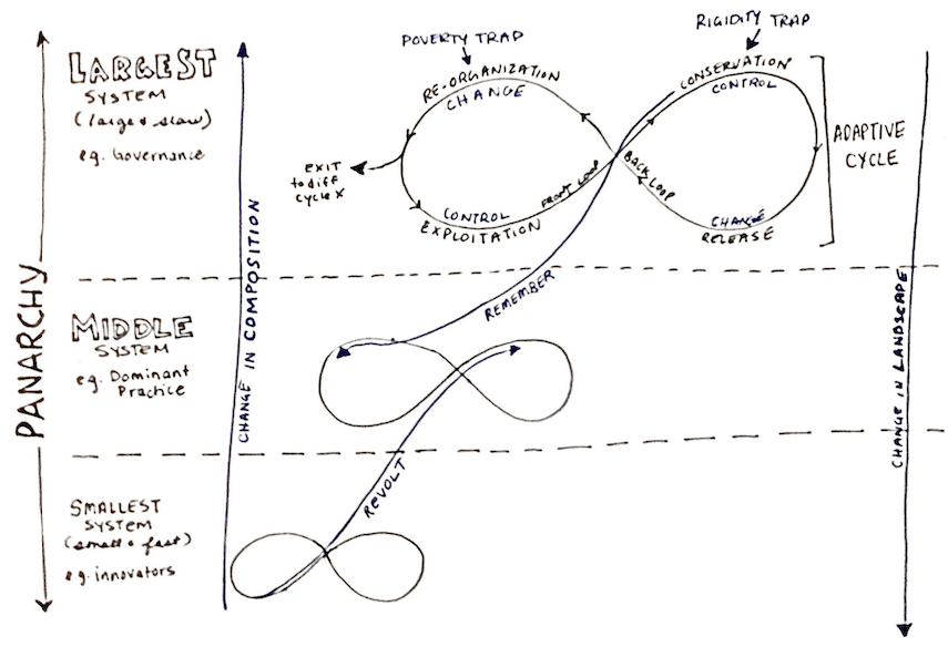 D’abord, la notion de cycle adaptatif (Gundeerson & Holling, 2002) montre le parcours de la création/innovation à sa transformation en quelque chose d’autre. La panarchie montre l’imbrication de tels cycles à différentes échelle. Les représenter permet de mieux comprendre les dynamiques de changement : émergence, mais aussi réaction de rejet, poids du souvenir…