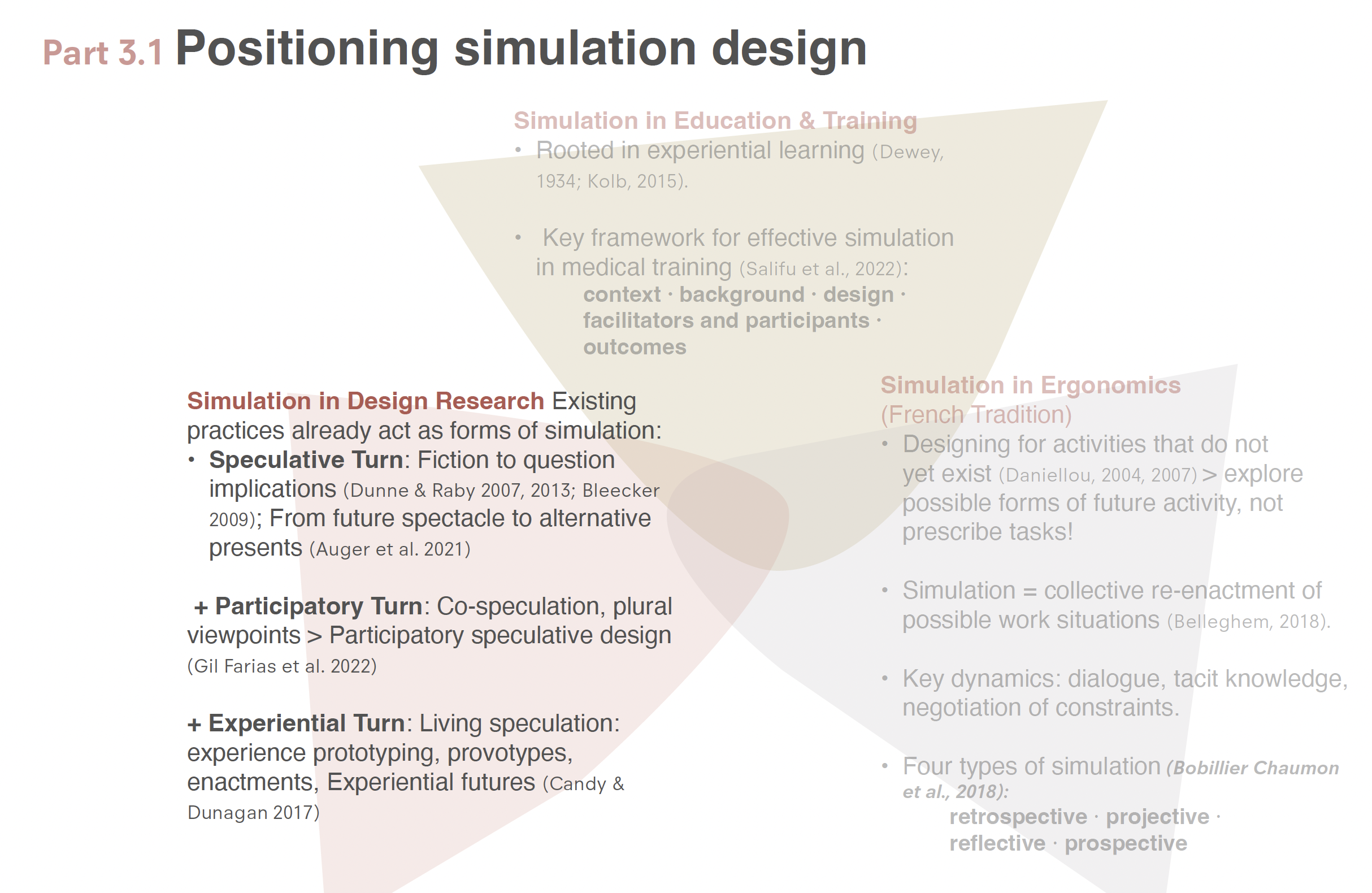 Au cĹ“ur de toute cette rĂ©flexion, le fil rouge : l’expĂ©rimentation des scĂ©narios d’usage par l’expĂ©rience et la fiction. C’est aussi le cĹ“ur de l’approche proposĂ©e dans cette HDR par l’approche de “Simulation design”. Ce n’est pas un concept nouveau. C’est une manière de relier des pratiques existantes de simulation (ergonomie, design fiction, simulation mĂ©dicale) pour combler ce que Candy et Dunagan appellent l’“experiential gulf”, ce gouffre entre des idĂ©es abstraites et la vie telle qu’elle est vĂ©cue.