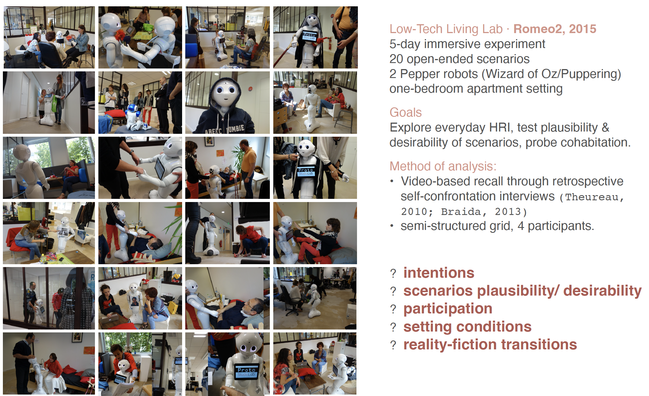 En 2015, nous avons installĂ© un Low-Tech Living Lab : un appartement bricolĂ©, deux robots Pepper animĂ©s en Wizard-of-Oz, et vingt scĂ©narios ouverts. Pendant cinq jours, nous avons jouĂ©, discutĂ©, puis rejouĂ© ces scĂ©narios. Cette oscillation entre fiction et analyse a produit des apprentissages uniques : comprendre comment un robot trouve (ou ne trouve pas) sa place dans le quotidien d’une personne agĂ©e dans son appartement.