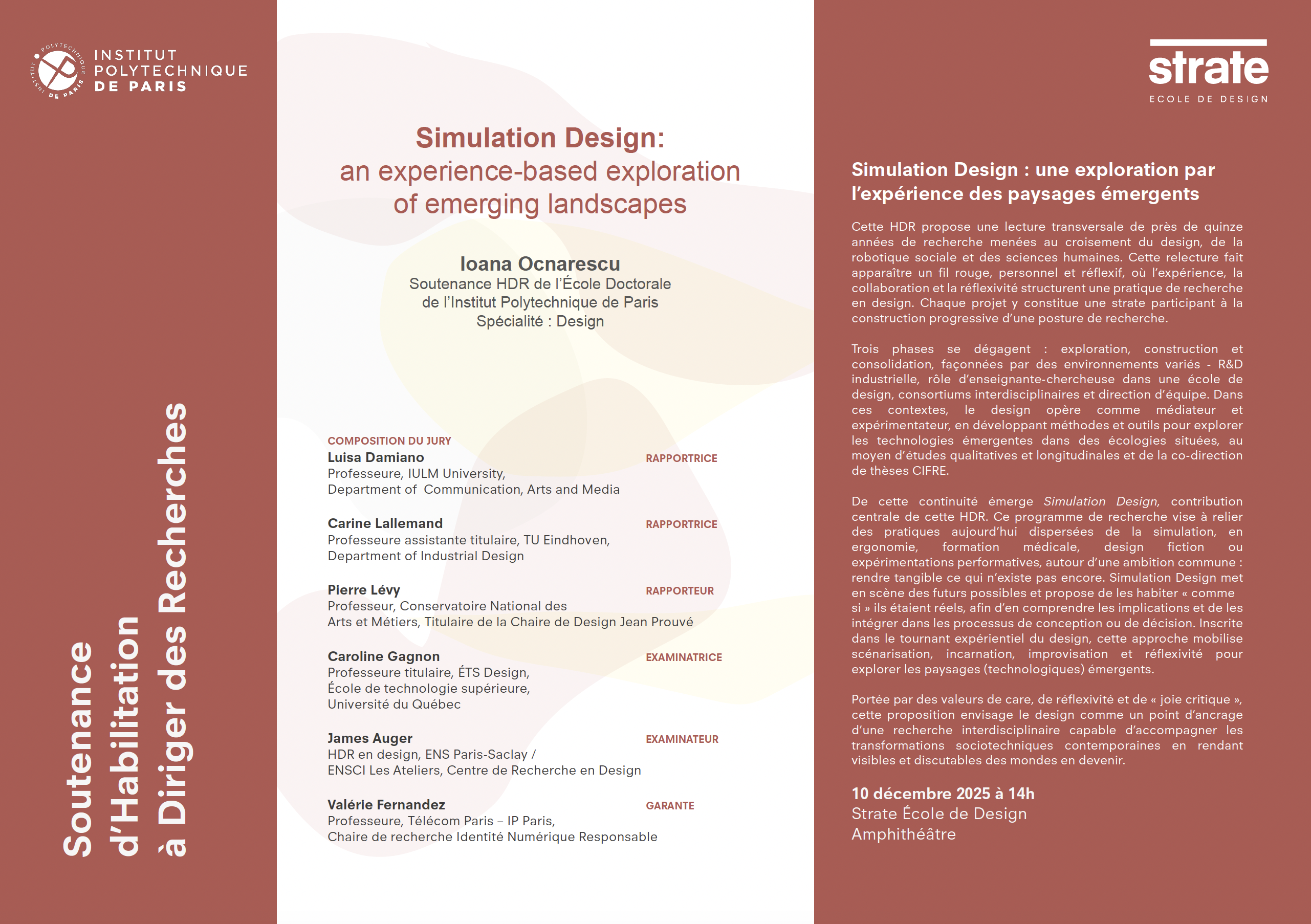 Le 10 dĂ©cembre dernier, j’ai soutenu mon HDR (Habilitation Ă Diriger des Recherches) au sein de l’Institut Polytechnique de Paris. Un moment intense, bilan et projection, oĂą 15 annĂ©es de projets, de collaborations, d’opportunitĂ©s et de doutes (!) se sont condensĂ©es en 3 heures de prĂ©sentation et de discussion du manuscrit en anglais qui s’intitule: “Simulation Design: an experience-based exploration of emerging landscapes” (en fr. Simulation Design : une exploration par l’expĂ©rience des paysages Ă©mergents).