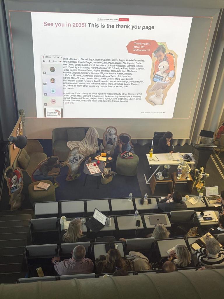 Enfin, Pierre Lévy a insisté sur mon positionnement critique mais constructif vis-à -vis de la technologie. Ni techno-enthousiaste, ni techno-critique, le manuscrit propose la technologie comme un révélateur des relations humaines, un prétexte pour rediscuter ce qui nous relie. Nous avons aussi échangé sur la définition du robot et la frontière avec les objets intelligents : ce qui change, ce n’est pas seulement la fonction, mais la perception d’une présence sociale, cette oscillation entre objet et sujet que nous avons observée avec Pepper. Enfin, Pierre m’a interrogée sur les zones « dangereuses » du programme simulation design : ce qui gratte encore. J’ai évoqué trois défis : la question des compétences nécessaires pour « jouer » la simulation, la durée des expériences (comment aller vers du long terme, du vrai « into the wild »), et la dimension performative du jeu social, inspirée du théâtre. Ces points sont autant de chantiers ouverts, qui feront évoluer le programme dans les années à venir.